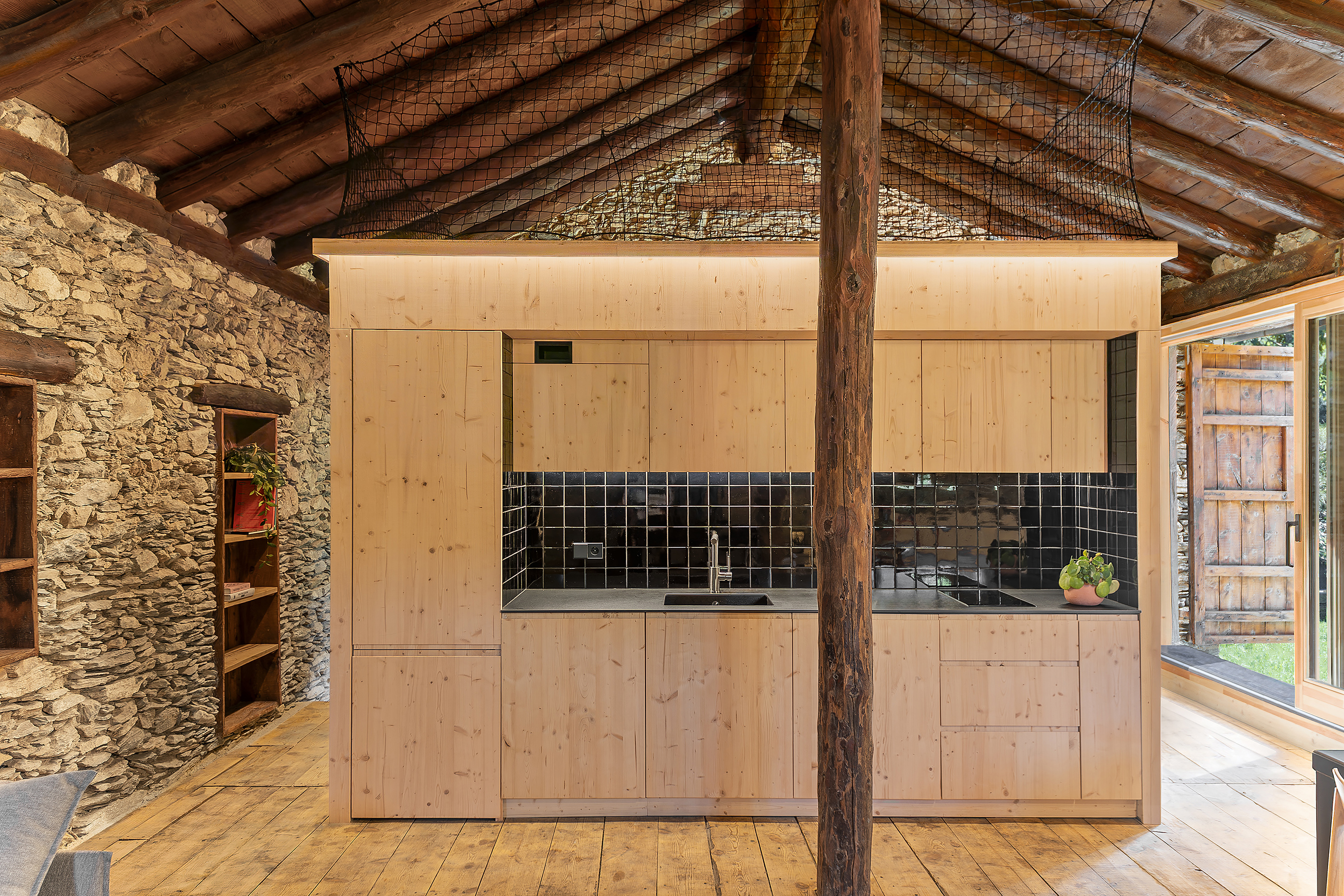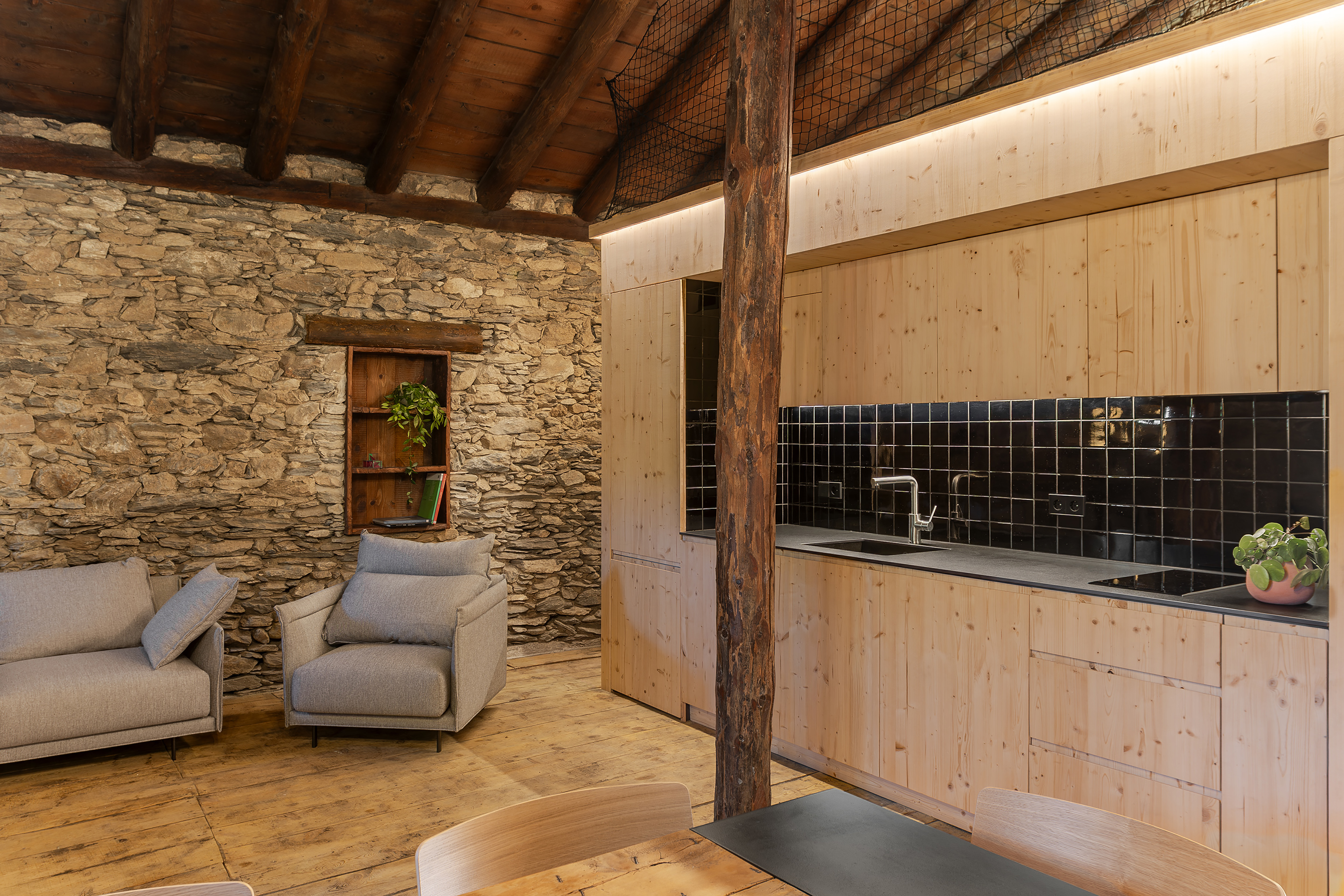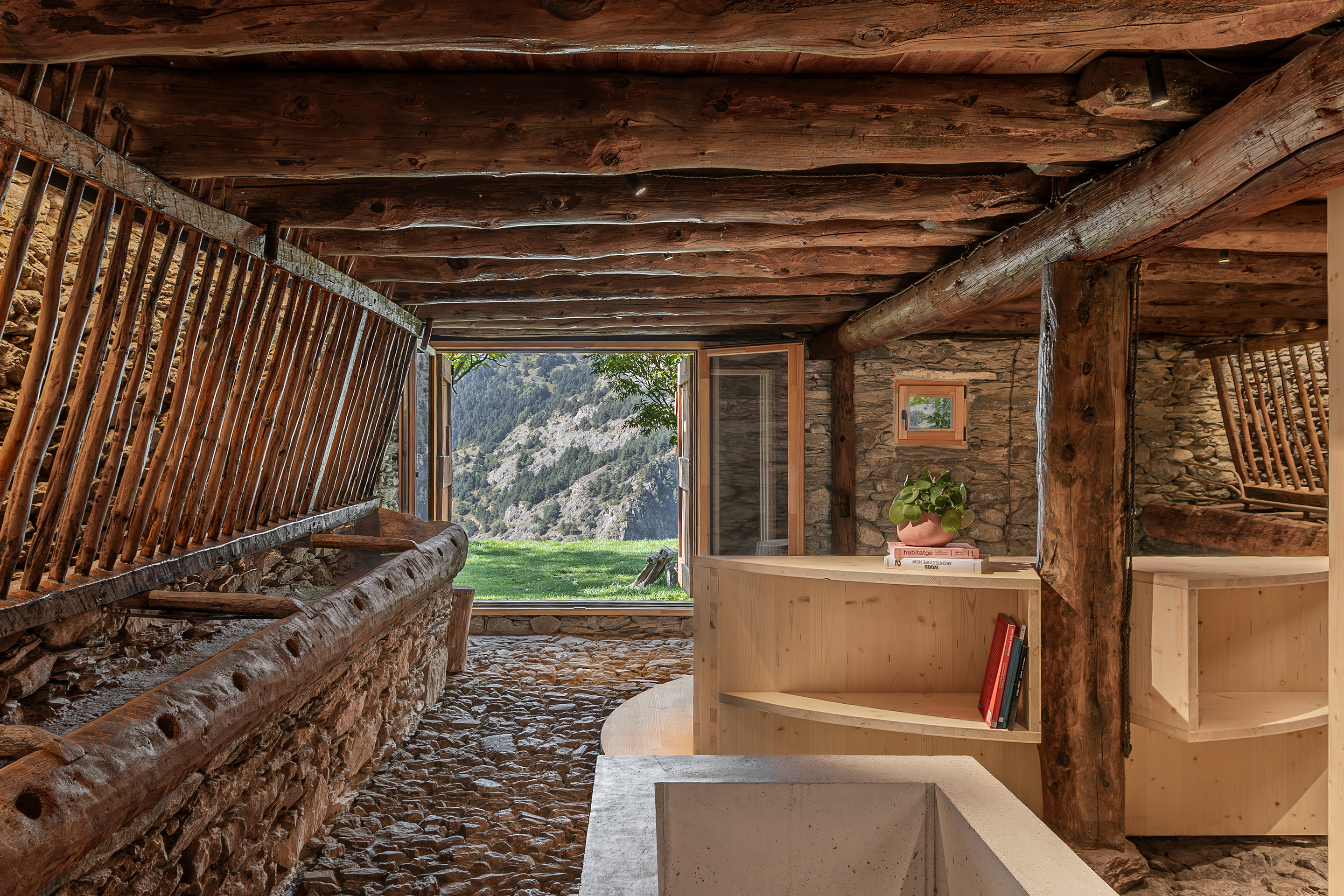 La Borda el Cultià, situada al Pirineu andorrà, ha estat rehabilitada amb una intervenció mínima i respectuosa que manté intacta la major part de l’edifici original. El projecte concentra els nous usos en una caixa de fusta inserida dins el volum existent, que acull banys, cuina i espais tècnics. Aquesta solució, de baix impacte ambiental i pràcticament reversible, permet ordenar els espais sense alterar l’estructura històrica. Els espais perimetrals es conserven oberts i flexibles, de manera que poden funcionar com a habitacions, sales o menjadors, preservant l’essència agroramadera i patrimonial de la borda.