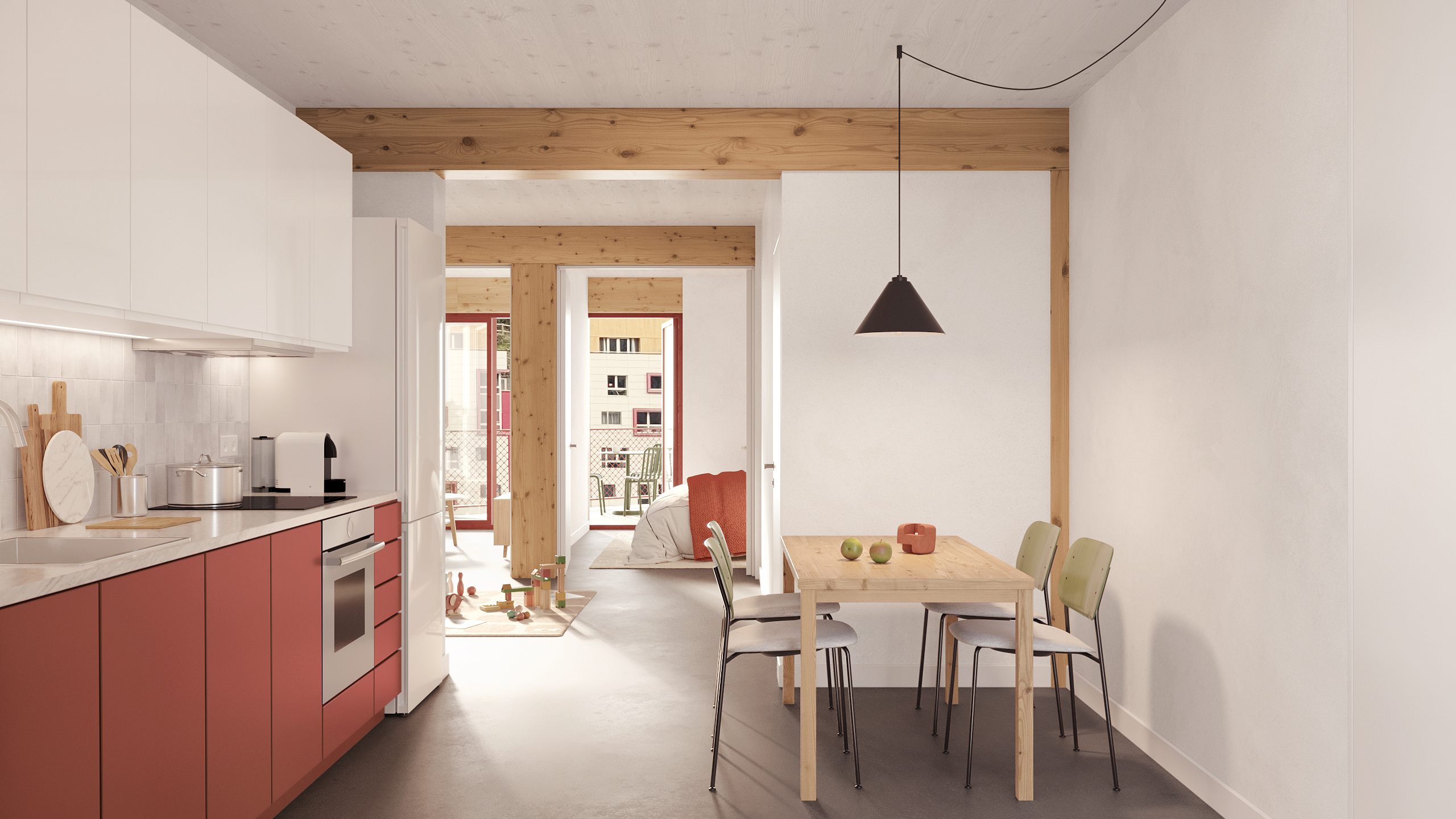 Per sobre del sòcol s’aixequen sis plantes d’habitatges resoltes amb una estructura de fusta de pilars, bigues i murs portants. Aquesta decisió redueix la petjada ambiental i el pes de l’edifici, alhora que aposta per materials sostenibles i saludables. El sistema estructural de pilars i jàsseres de fusta laminada i forjats de CLT permet també una gran flexibilitat, facilitant possibles canvis de distribució o d’ús al llarg del temps.