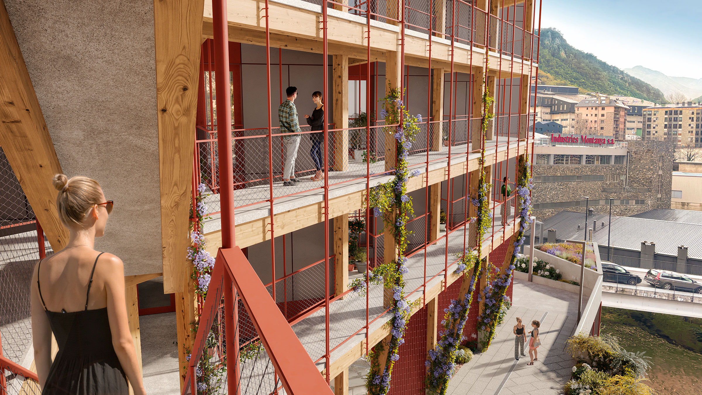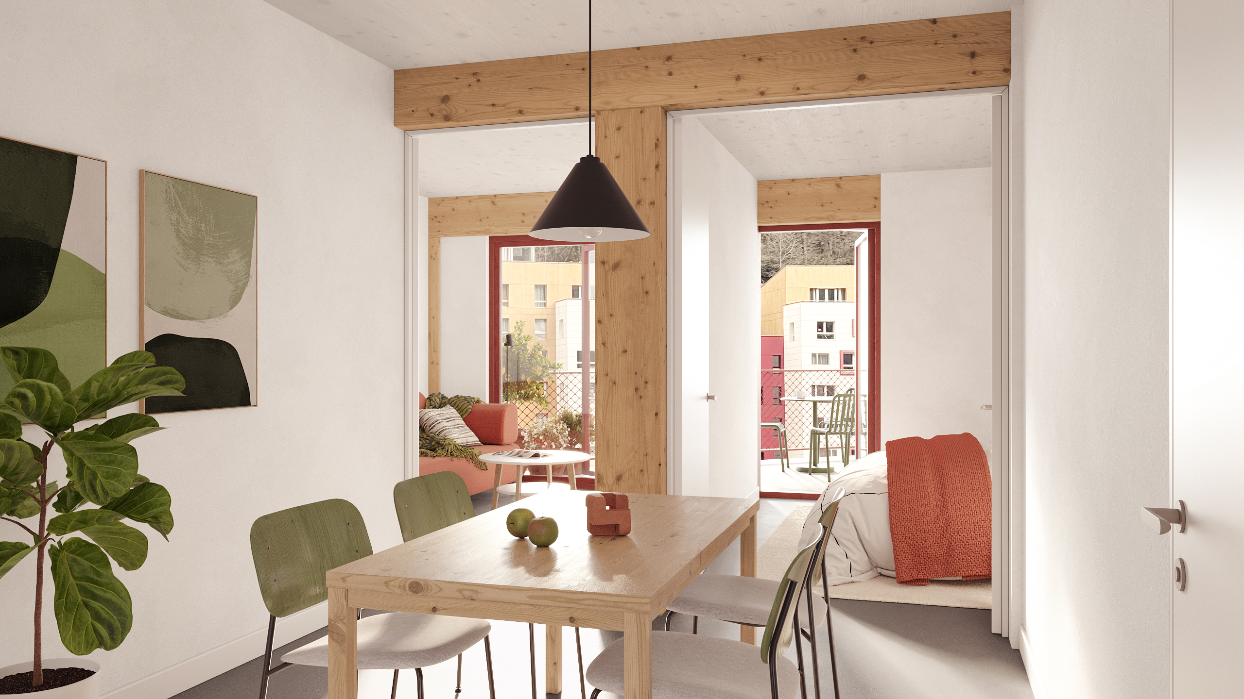 Els habitatges s’organitzen en tres tipologies —d’1, 2 i 3 habitacions— amb espais no jerarquitzats i distribucions flexibles, pensades per respondre a les diverses maneres d’habitar contemporànies de forma democràtica i inclusiva. La façana incorpora un retranqueig ortogonal amb un gir de 45 graus respecte a l’alineació del carrer, optimitzant l’assolellament i evitant l’ombra de la muntanya. Aquest gest genera balcons privats orientats a sud i patis intermedis a nord, que actuen com a espais de transició entre el públic i el privat.