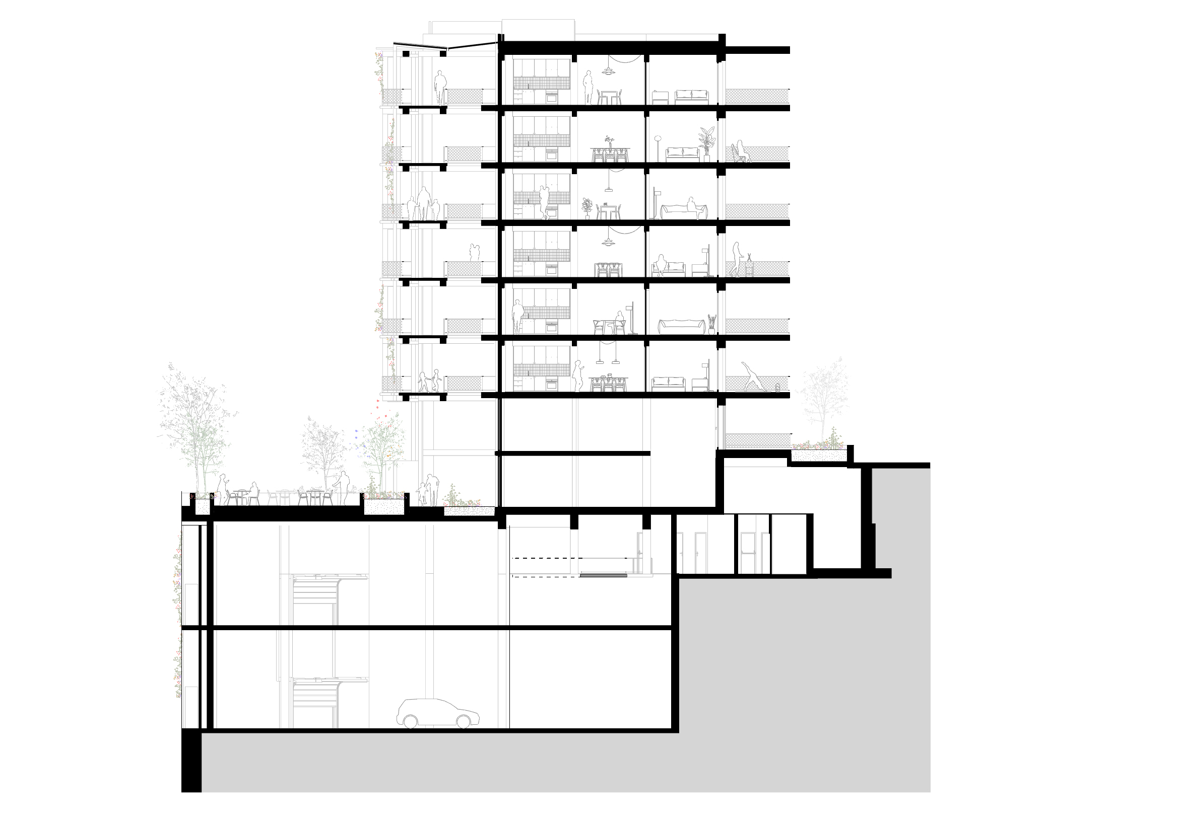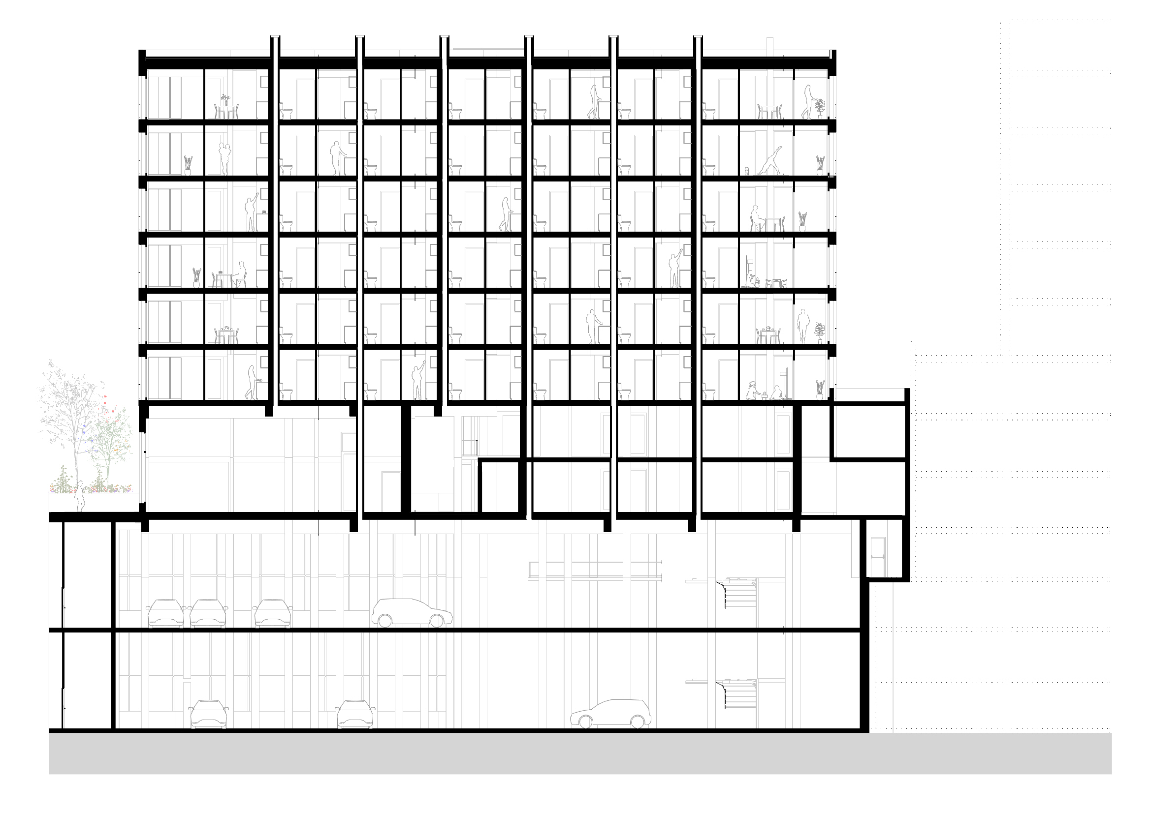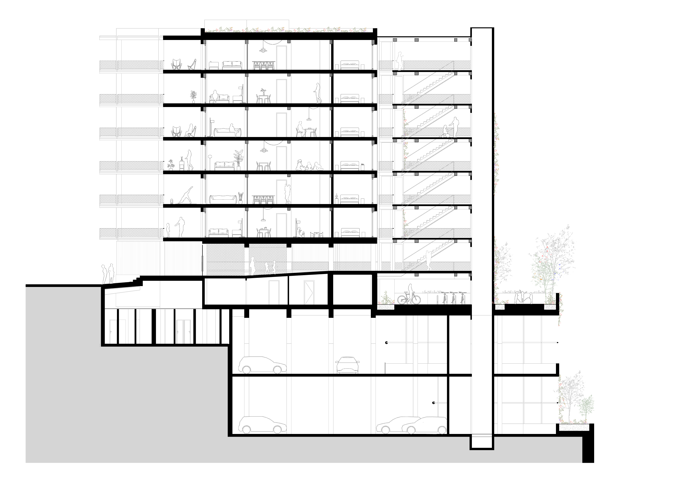 Per minimitzar tant els costos com l’impacte ambiental associat a l’excavació, la superfície d’aparcament s’ha ajustat estrictament als requeriments normatius. L’aparcament es resol amb dos forjats a doble alçada, fet que permet assolir la cota del carrer superior amb una excavació mínima i mantenir, alhora, la flexibilitat necessària per a possibles ampliacions futures. Les plantes baixa i primera funcionen com un sòcol actiu que integra els usos públics per tal de fomentar la relació del nou edifici amb l’entorn. Aquestes plantes que estan en contacte amb el terreny, s’han realitzat amb una estructura de formigó in situ..