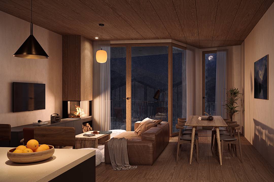 Àliga Ski compta amb 46 habitatges, d’un, dues i tres dormitoris. Tots els pisos tenen les habitacions i sales d'estar que donen a l'exterior, sense patis, per gaudir de les vistes i l'entorn. Les cobertes inclinades, característiques de l'arquitectura tradicional de muntanya, s'han treballat amb un estil contemporani, obrint les sales d'estar cap a les vistes i integrant-se amb l'entorn. Cal destacar l'interiorisme de disseny amb un estil de muntanya que utilitza la fusta i les llars de foc per crear un ambient acollidor.