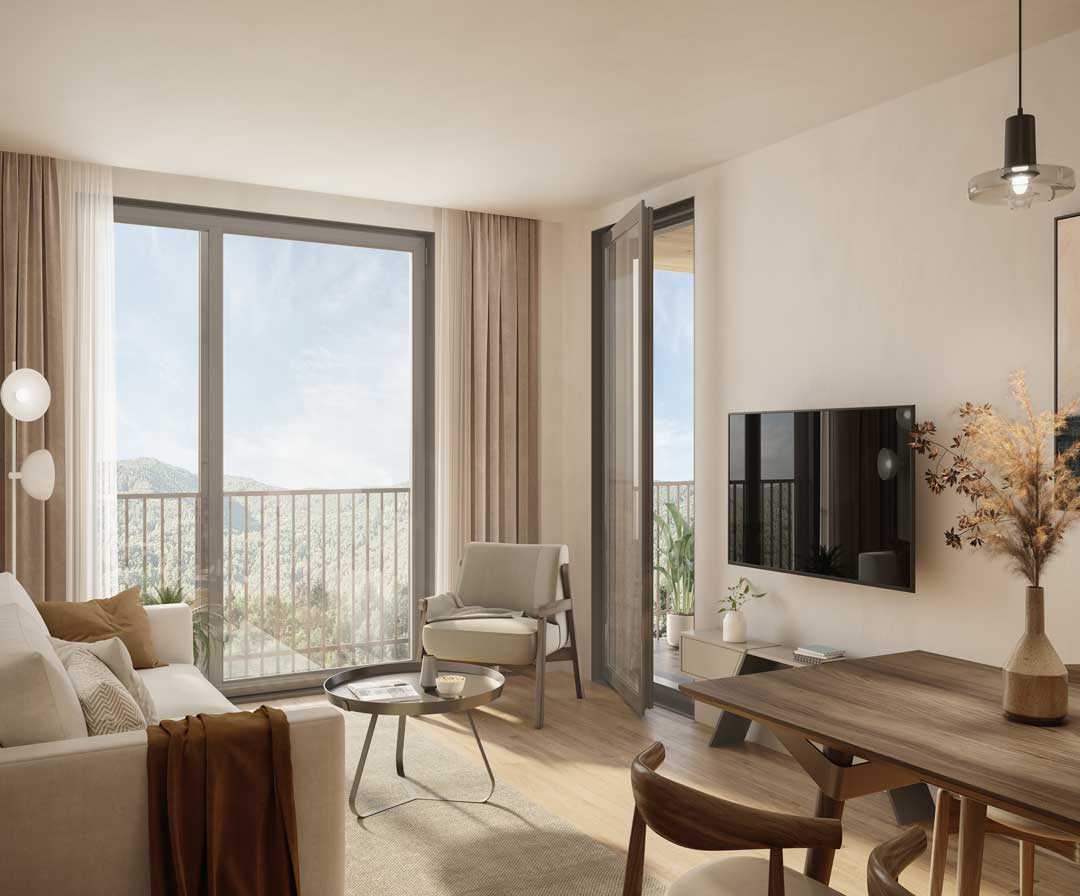 A la darrera planta, s’introdueixen tipologies diferents d’habitatges que disposen de terrasses més grans. Aquest canvi en la secció juntament amb tractament de nous materials en la façana permet reduir l’alçada aparent de tot el volum.