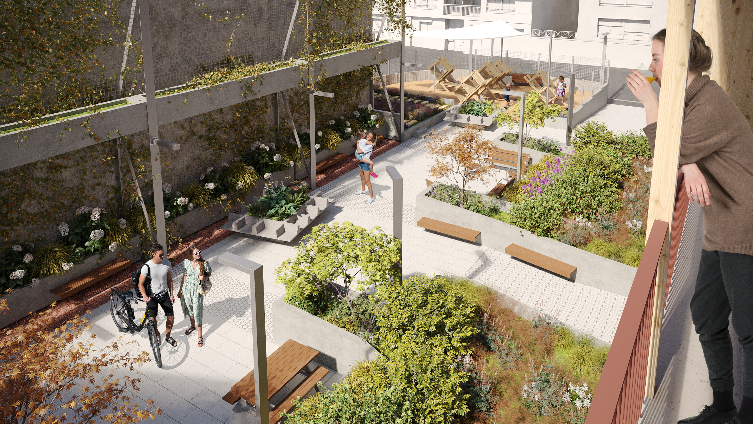La planta baixa incorpora un espai social per a la gent gran del barri, amb zones de reunió, menjador i activitats, connectat directament amb un espai públic verd i polivalent. Aquest parc urbà ofereix jocs per a totes les edats i espais de trobada i activitat saludable a l’aire lliure, fomentant la cohesió comunitària.