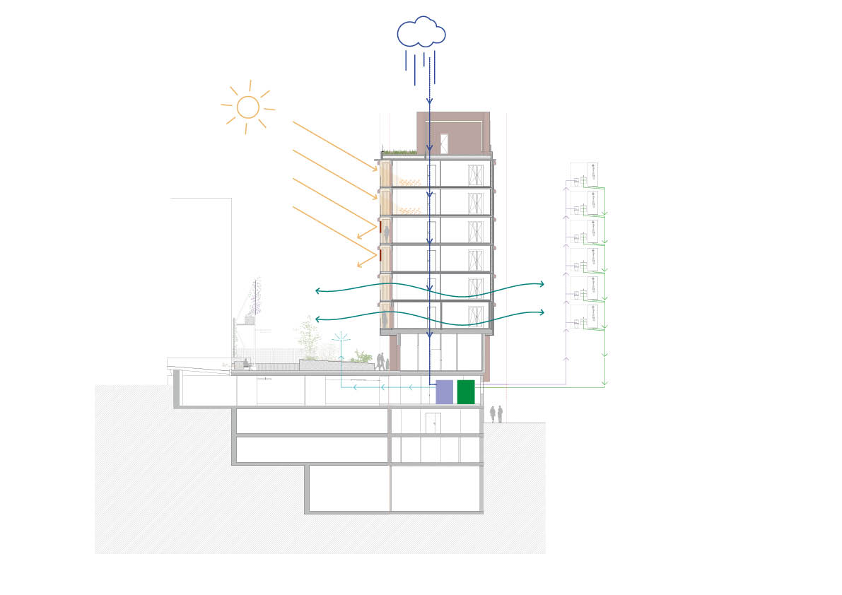 El projecte El Cedre sorgeix de l’aprofitament d’una estructura de formigó preexistent que conforma les plantes soterrades, inicialment pensades per a aparcament. L’objectiu principal és minimitzar l’impacte ambiental i energètic de la construcció i, alhora, donar resposta a la necessitat d’habitatges assequibles. Per aconseguir-ho, es planteja construir les sis plantes superiors íntegrament amb estructura i tancaments de fusta, reduint el pes afegit a l’edifici i potenciant l’ús de materials de baix impacte com façanes de fusta, finestres de fusta o sistemes de reaprofitament d'aigües.