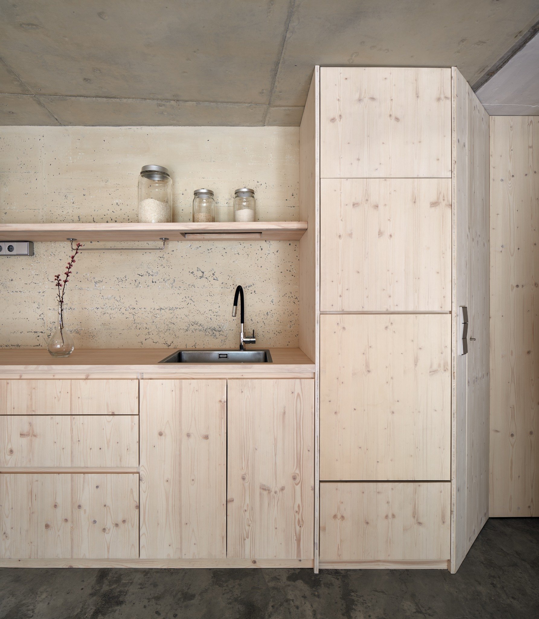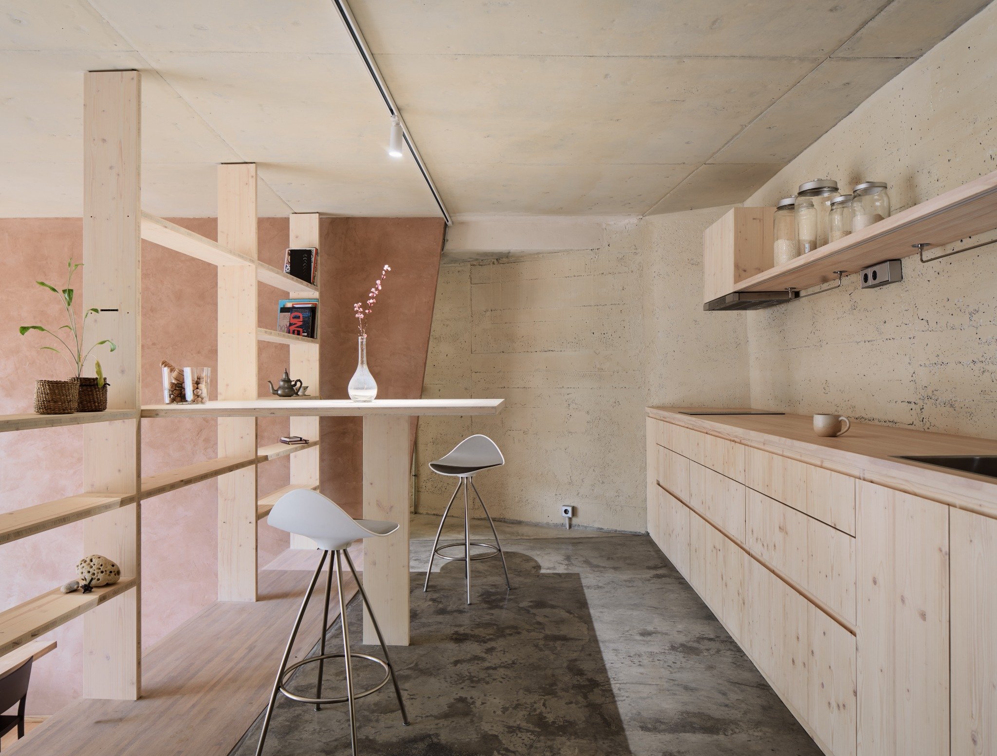 Els materials naturals i transpirables són la base del projecte: fusta tractada amb olis, parets d’argila, morters de calç i pintures minerals de silicats. Aquestes solucions garanteixen un ambient interior lliure de COVs i formaldehids, aconseguint un aire sa i confortable. El mobiliari fet a mida, com la cuina i els prestatges en fusta d’avet, aporta calidesa i continuïtat material.