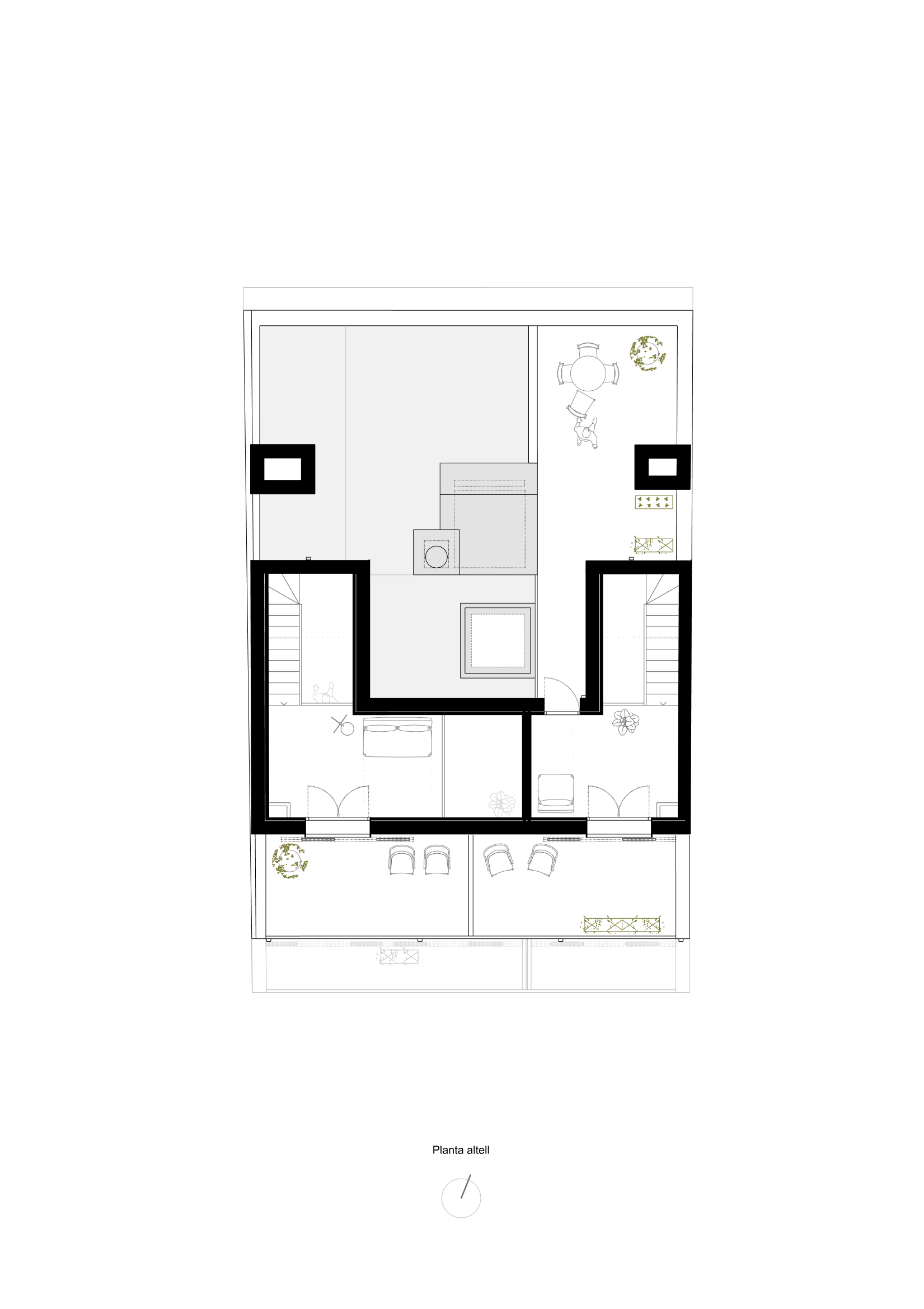 Sobre els murs existents s’ha afegit una nova planta amb una arquitectura lleugera amb forjats de fusta amb dos nous àtics dúplex.