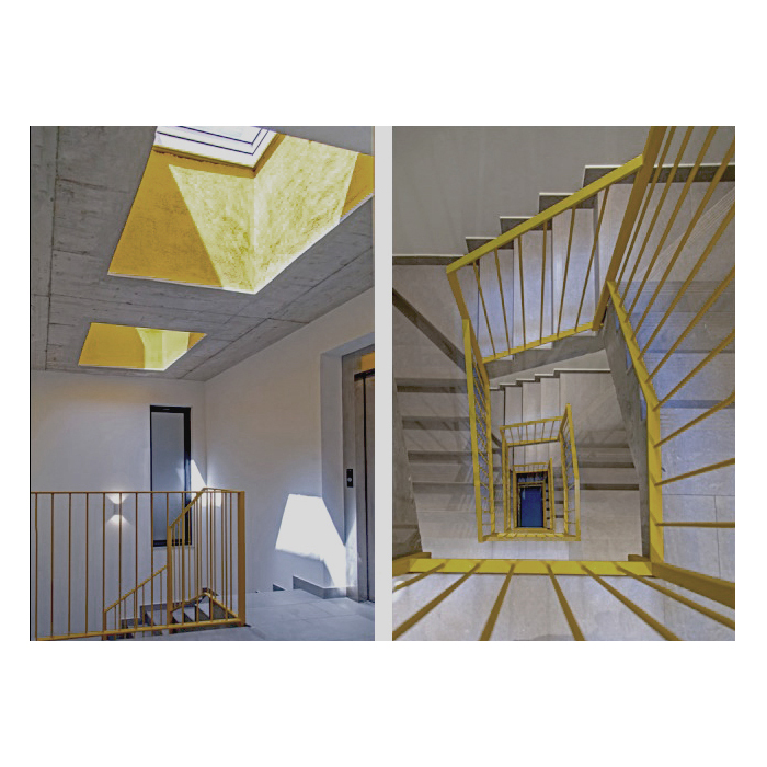 Aprofitant la reforma, s’ha refet l’escala i s’ha instal·lat un ascensor. Aquest nucli de comunicació té 2 grans lluernaris que milloren la seva qualitat, i s’han volgut remarcar amb l’ús d’un color càlid grogós-ataronjat com la barana interior.