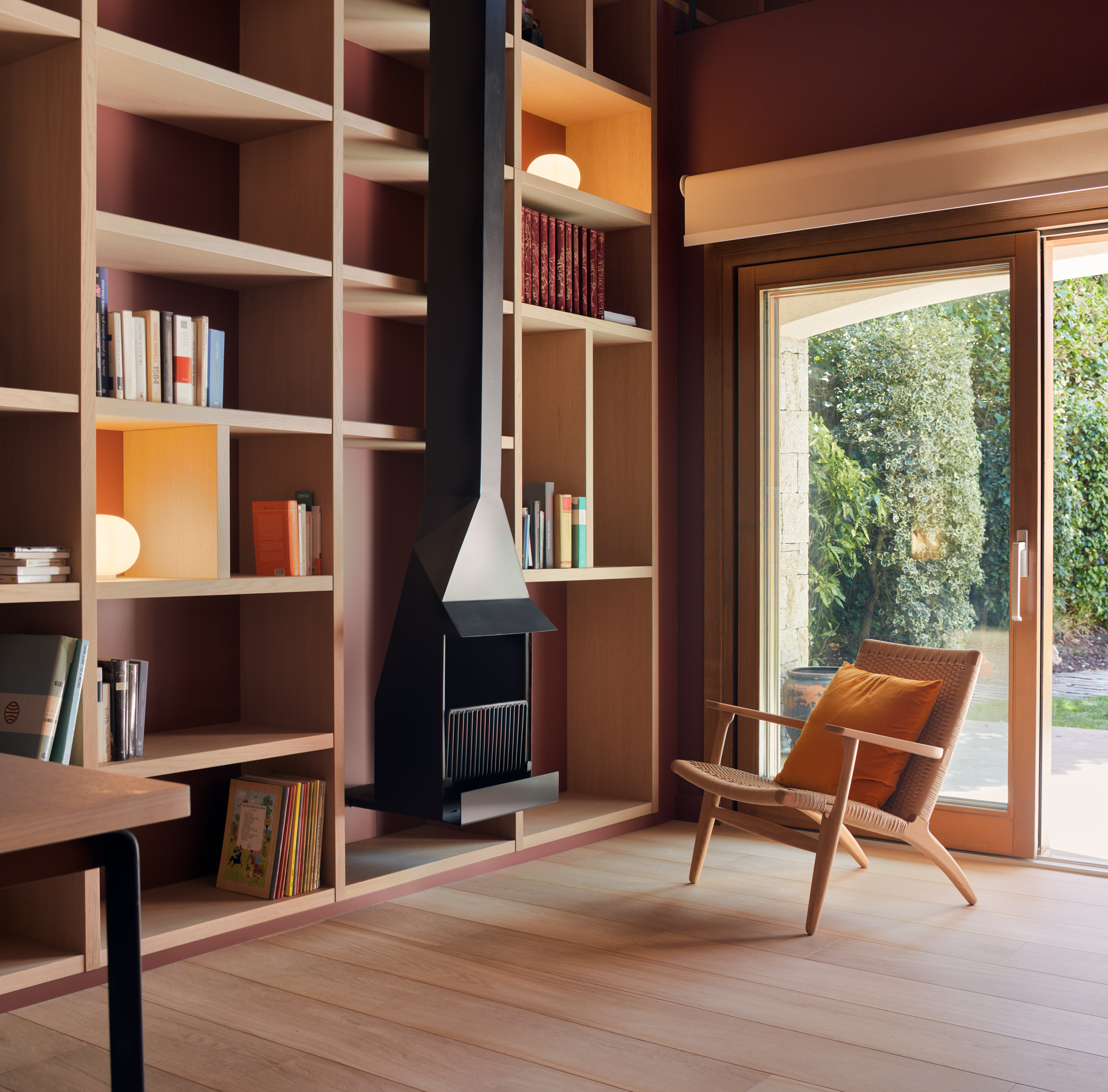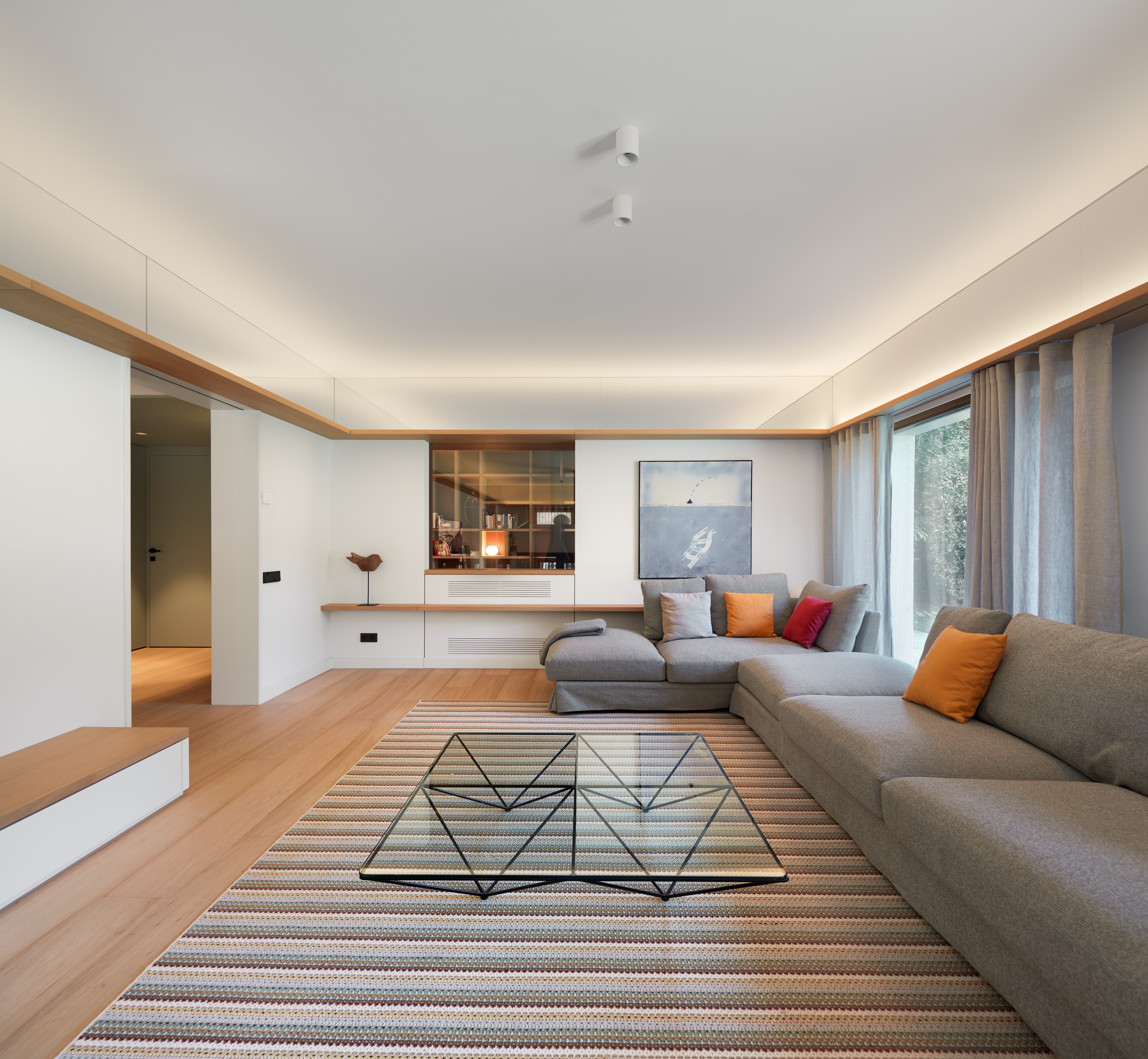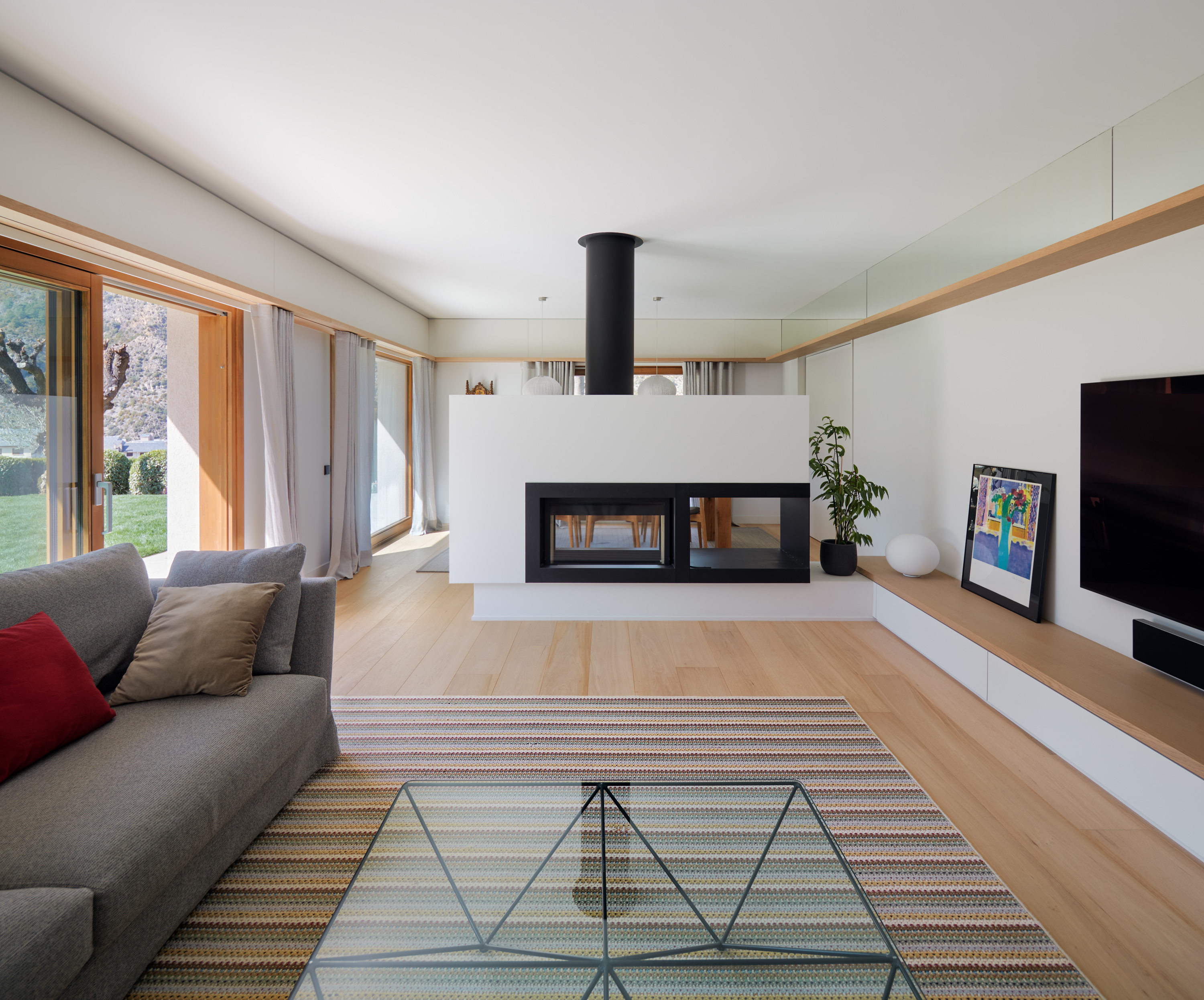 Des de l’accés s’accedeix a la sala d’estar-menjador a través d’una gran obertura que hem ampliat per tal de reforçar la visió del jardí principal de la casa en entrar a l’habitatge. La peça existent de l’estar menjador era gran i tenia una proporció allargada. Per aquest motiu hem decidit situar la llar de foc a doble cara al mig de l’estança delimitant de manera subtil l’espai d’estar i del de menjar. Amb la col·locació d’una cornisa de fusta per sobre l’alçada de les finestres en el perímetre de l’estança s’ha integrat els elements més tècnics que donen confort als habitants; com una llum indirecta i les guies de les cortines. Aquest pla de fusta torna a aparèixer més proper al terra per construir el moble de l’estar que acaba integrant la llar de foc generant espai d’emmagatzematge en la part inferior.