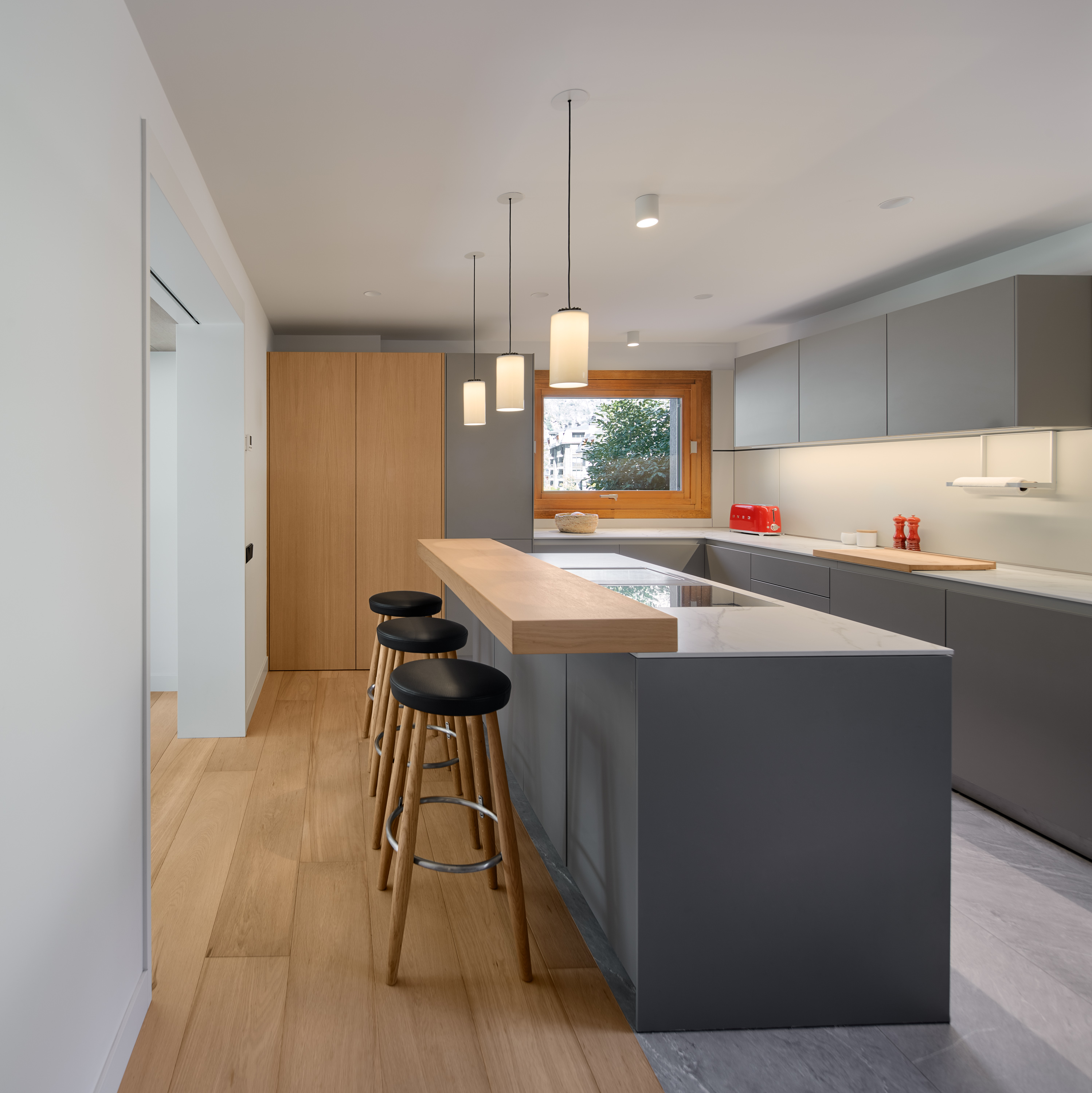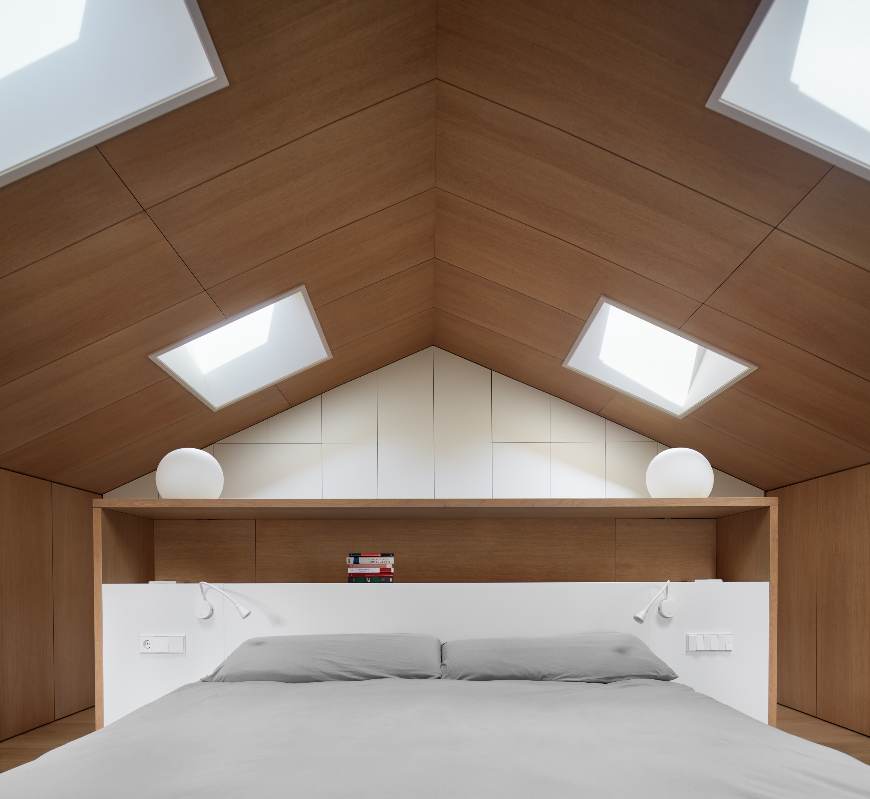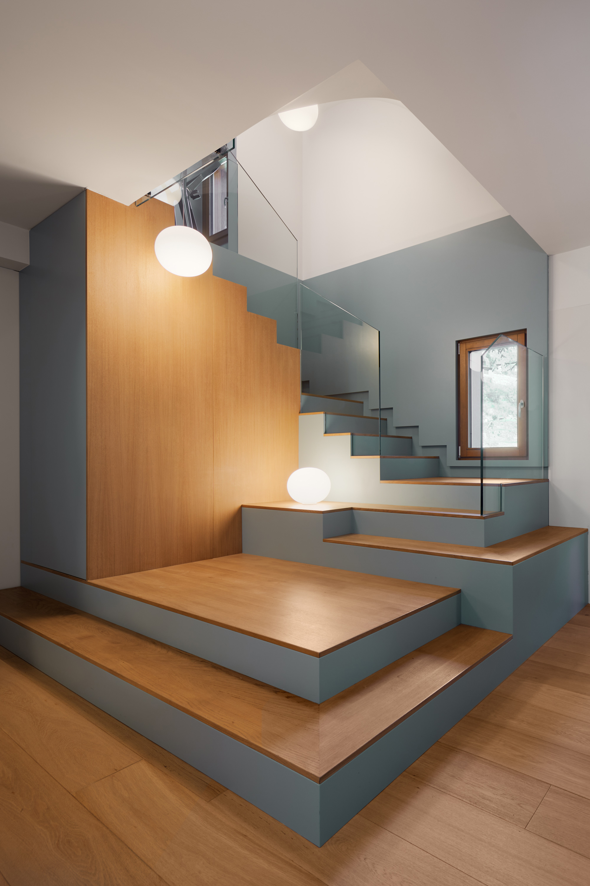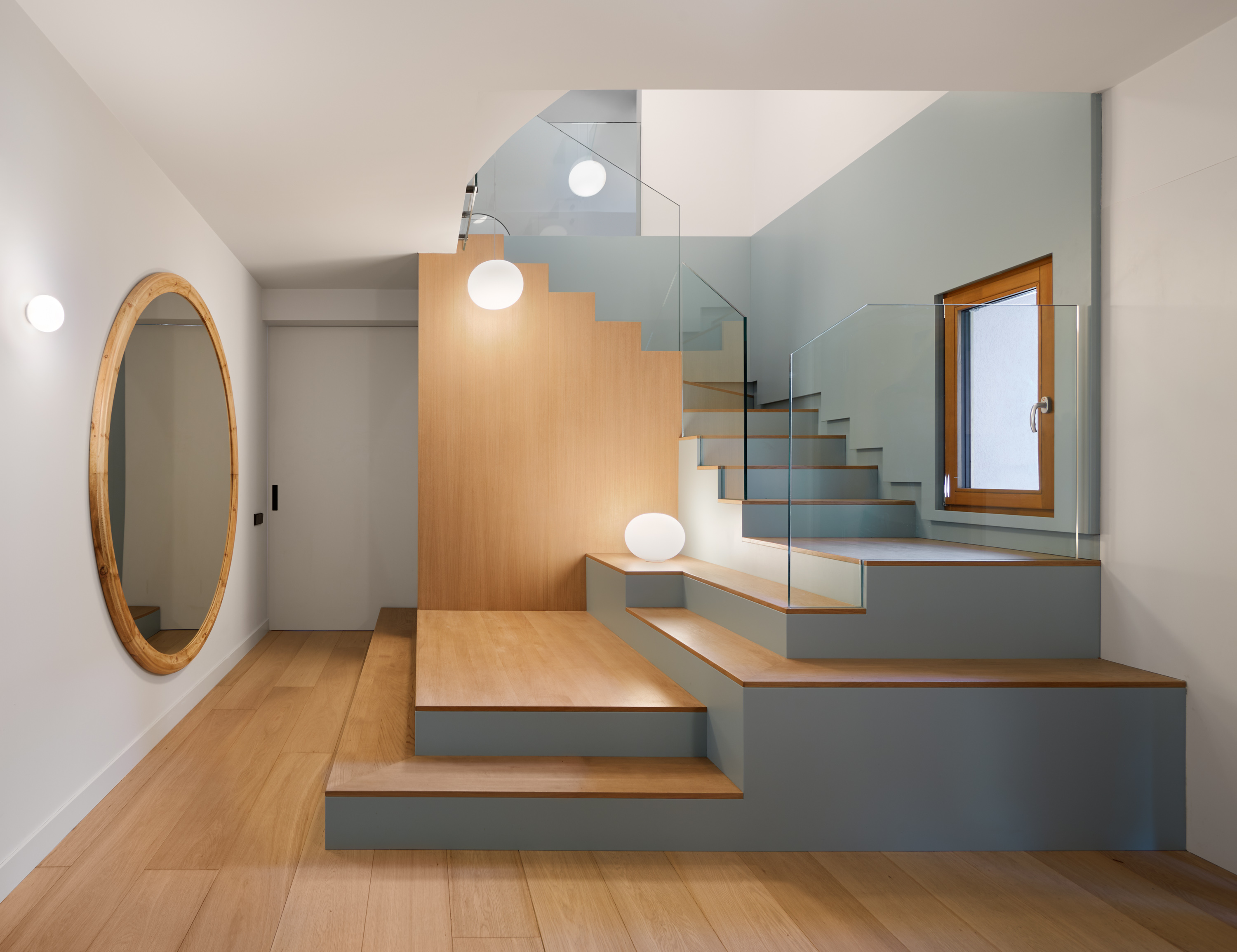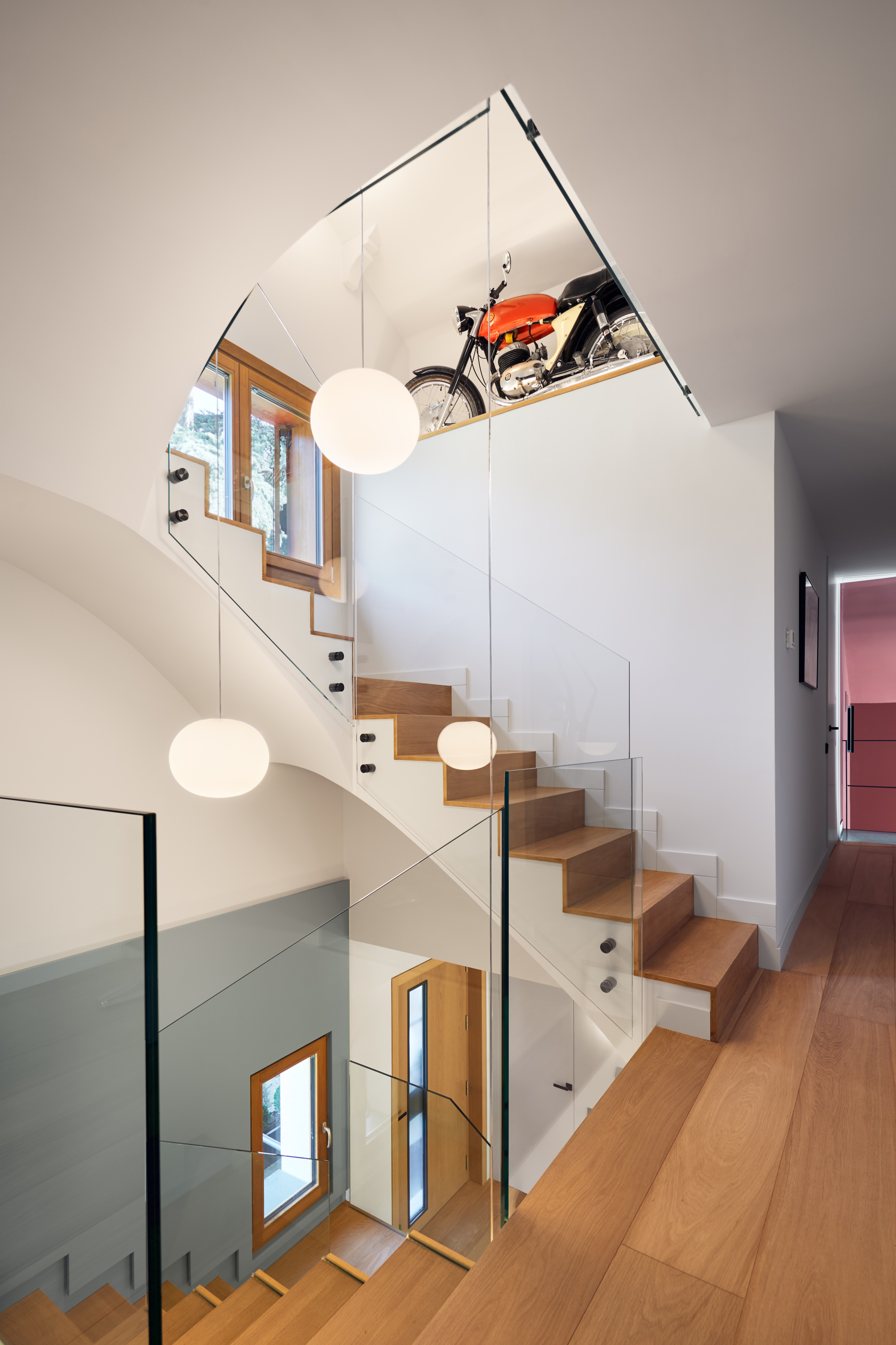 Només entrar, la casa ja et desperta la curiositat. L’accés en comptes de ser una entrada purament funcional amb una posició secundària en l’habitatge s’ha convertit en un dels espais singulars que articulen les circulacions de l’habitatge en incorporar l’escala. Aquesta s’ha tractat com una grada que va situant esferes de llum a diferents nivells fins a la coberta.
