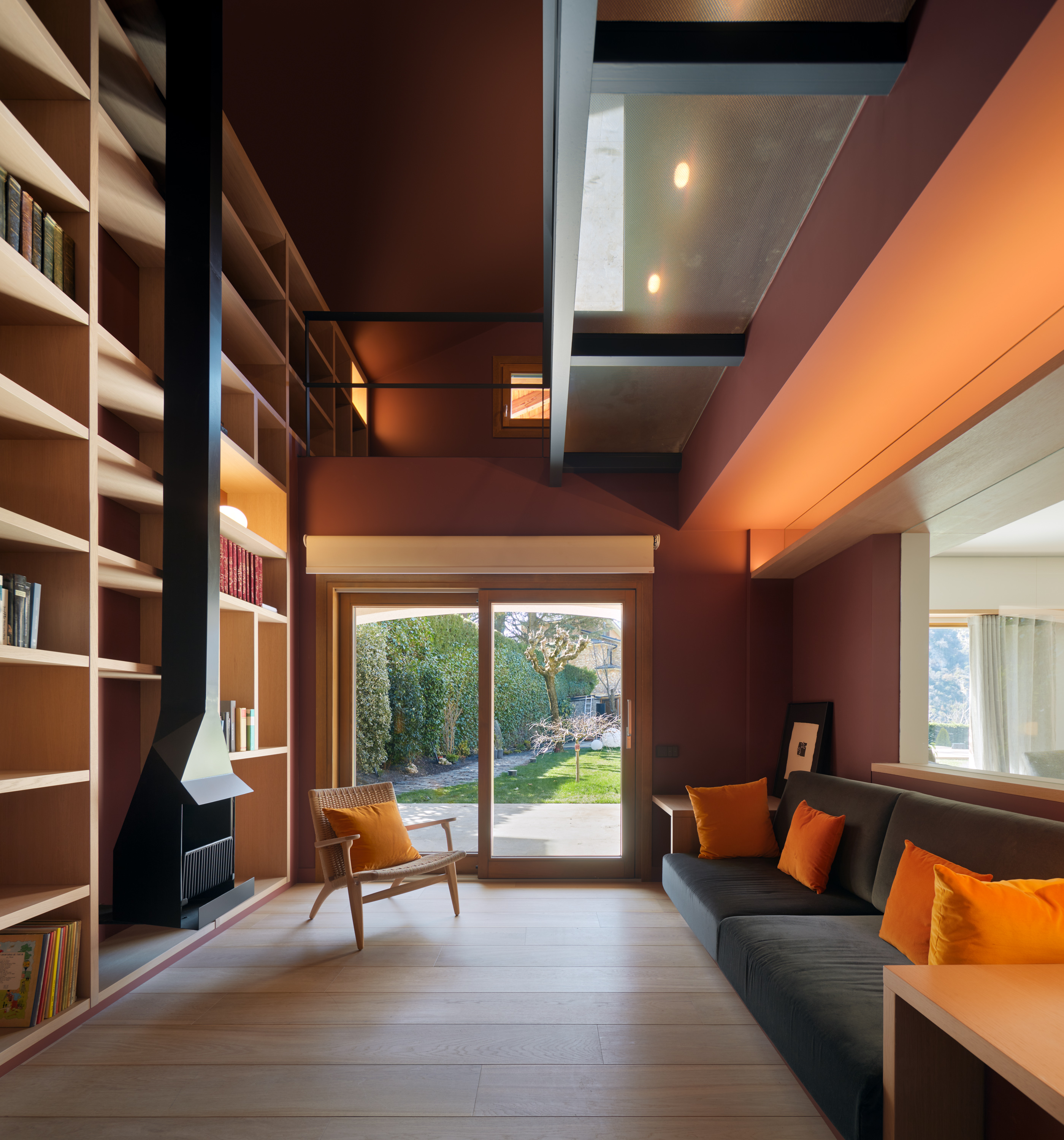 La biblioteca també es troba en planta baixa amb una llibreria de més de 5 metres d’alçada per acollir una de les passions de les persones que hi viuen. Per aconseguir aquesta verticalitat hem enderrocat el forjat per unir l’habitació existent amb la del pis superior. L’espai de treball, els llibres, llar de foc, un sofà i la il·luminació fan d’aquest espai un dels més especials de la casa.